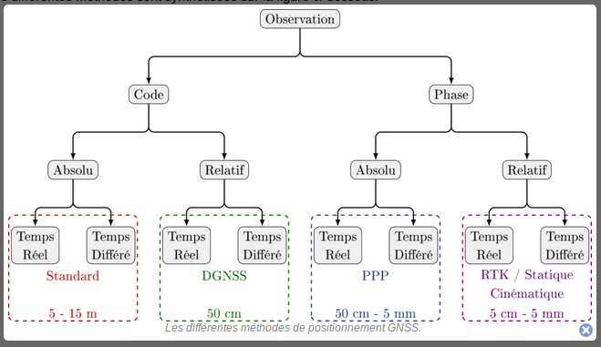 - RTK : Real Time Kinematic, positionnement relatif sur la phase en temps réel ; la précision est de l'ordre de 5 cm ;